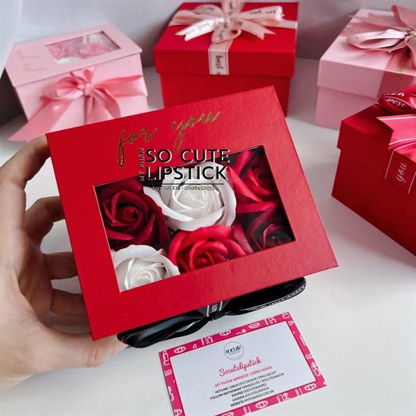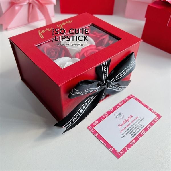 Hộp Quà Màu Đỏ 6 Hoa Mix Thắt Nơ (Son Dài)